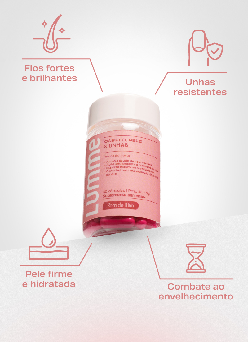 Meu cabelo caía tanto no banho que eu já evitava até pentear. Depois de algumas semanas com LUMME, percebi que os fios começaram a ficar mais firmes e o brilho voltou. Minhas unhas, que viviam quebrando no teclado do trabalho, finalmente estão resistentes. É a primeira vez em anos que me sinto realmente bem com minha aparência.
